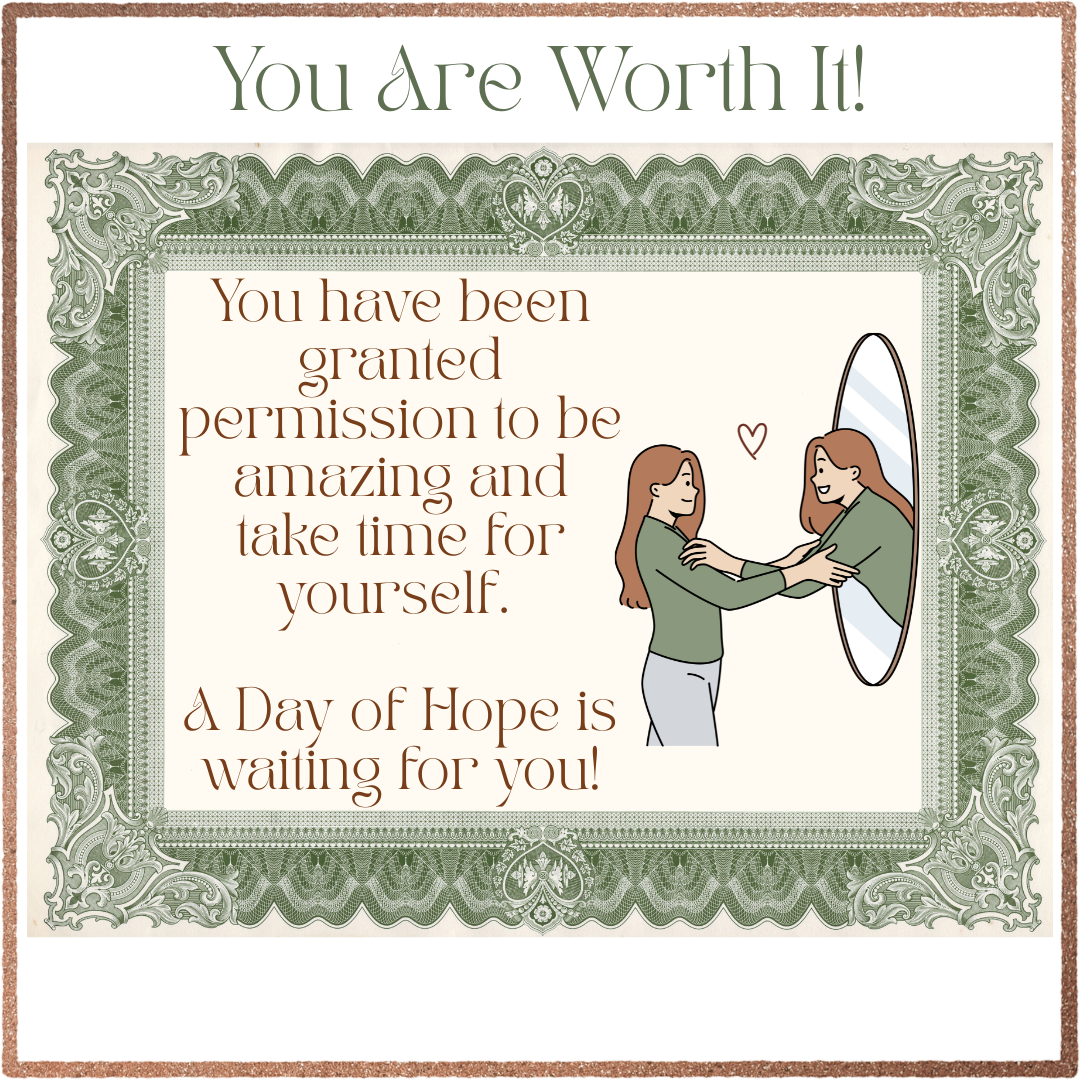 A day of hope is one day, or a full 24 hours, for you. Yes, just you. A day to do whatever you want, whenever you want, and however you want. On this one day you get to choose everything. You get to oversee what you do. You don’t have to worry about what anyone else wants or what anyone else thinks you should do. One full day to fuel up on what you want and need. It may not sound like a lot at first, but it’s likely more than you already get!